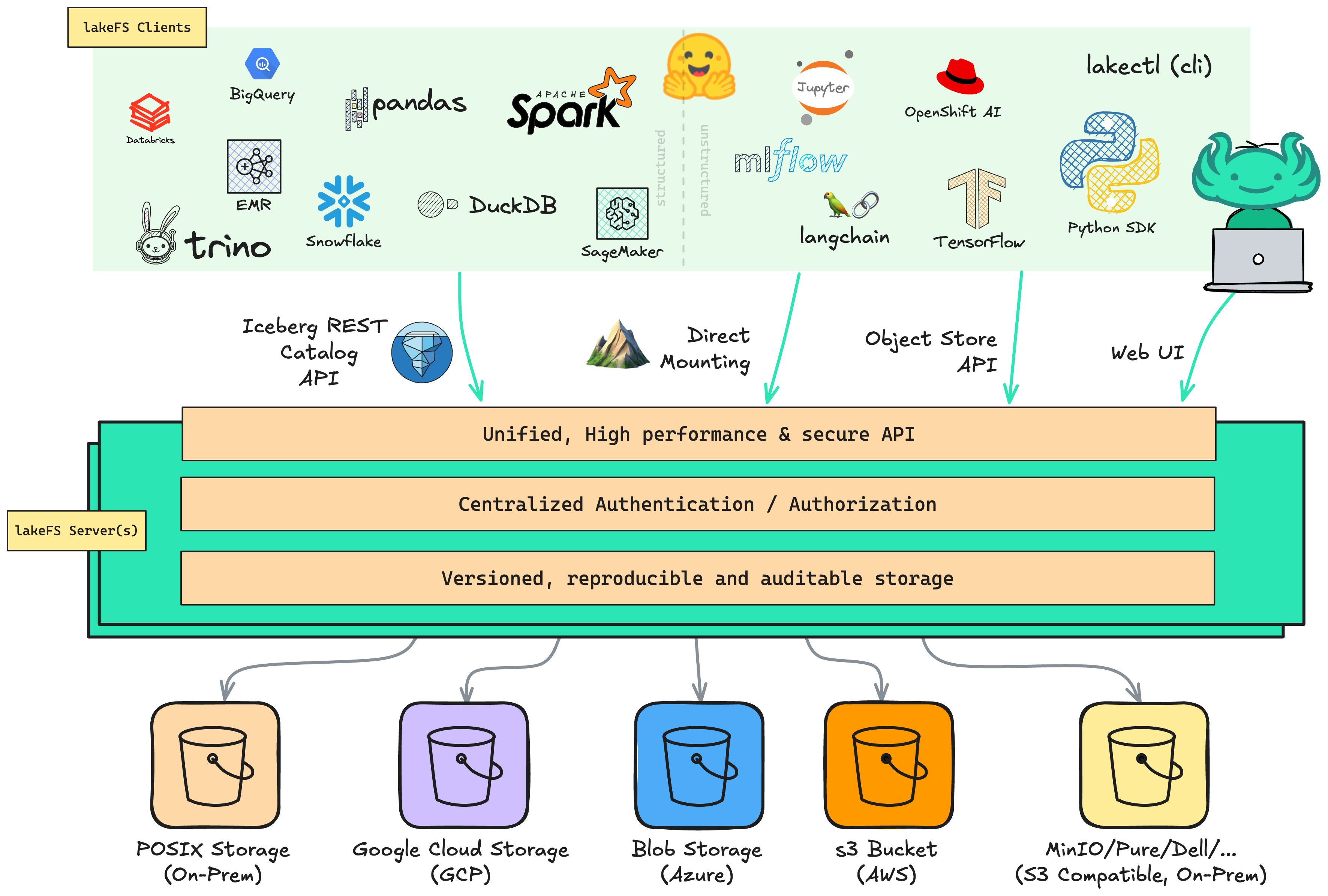 With lakeFS Enterprise, you can leverage multiple storage backend support to manage data across multiple storage locations, including on-prem, hybrid, and multi-cloud environments.